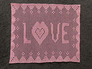 This is a pattern for a lovely filet crochet placemat or centerpiece. It would be great for Valentine’s day or a bridal shower or wedding decoration. It could easily be framed as well. The finished size is about 18”x 15” and is worked in size 10 crochet thread with a size 7/1.65mm steel crochet hook. There are written instructions to get started then the pattern is followed on a chart. There is a single crochet edging worked around the edge of this piece.