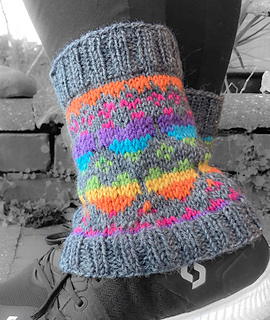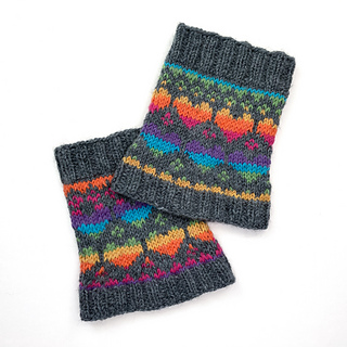 These knitted leg-warmers are worked in the round, top down, and feature a heart motif. The design combines a ribbed cuff with a stockinette body which is worked in two different colours simultaneously.
