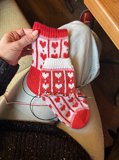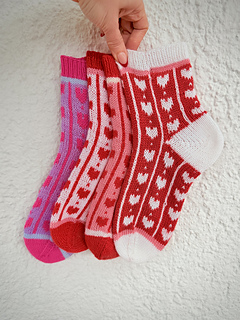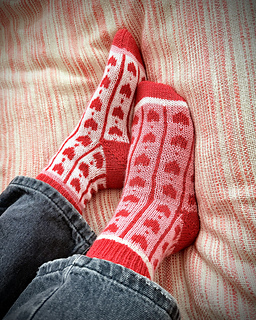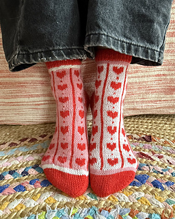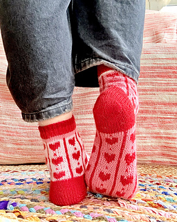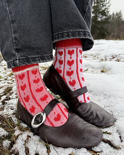 25% off until Valentine´s day. Coupon code Valentines on checkout for discount What´s the point of life without love? Whether it´s romantic, platonic, or even for your cat! A time to show gratitude for the people that help lift you up in life! I am delighted to share with you this new Valentine sock design to add some joy to your colorwork sock drawer. These Love-ly Heart socks use both horizontal and vertical stripes to accentuate the hearts, making the pattern easy to knit and remember, with just two colors and no long floats.
