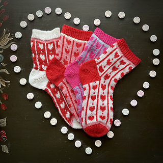 Knit from the top down, these socks have a short row heel (video tutorial included) and a fun to knit stranded colorwork hearts and stripes pattern in 3 different stitch count sizes. This colorwork section is knit using only two colors and is an easy to memorize, repeating pattern throughout the leg and foot of the socks. There are 3 different colorwork charts included in alternative colors for use to choose from.
