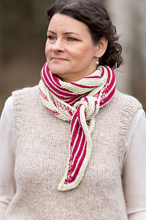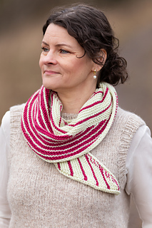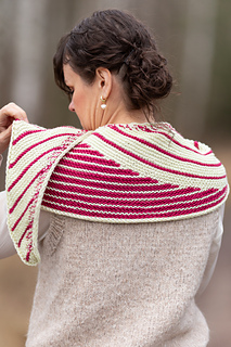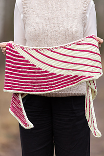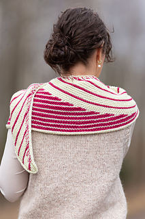 The shawl is worked side to side in two sections. It is shaped with increases along one edge and with short rows, where the stripe rhythm shifts. The yarns are carried neatly along the edge by working them together during the increase sequences.