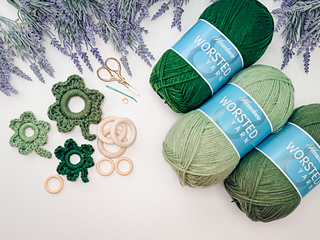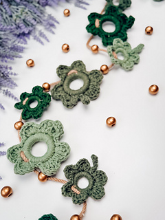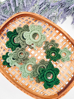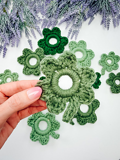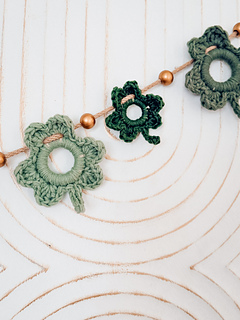 Each shamrock is worked in one piece by crocheting directly around wooden rings of two different sizes. The rings create those perfectly rounded leaves while giving the shamrocks a clean, structured shape that holds beautifully once finished.