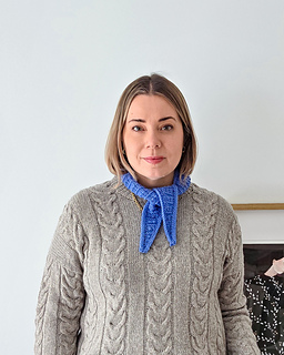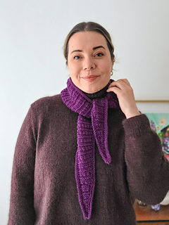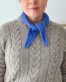 The Lucy Shawl is a small triangular kerchief designed to be worn in multiple ways. It comes in two sizes: Size 1 is a slimmer, shorter version that wraps comfortably around the neck once, while Size 2 is longer and allows for a cozy double wrap.