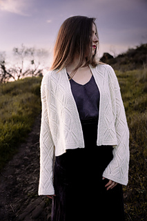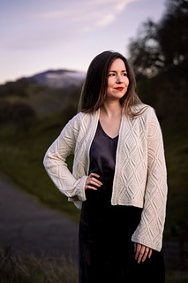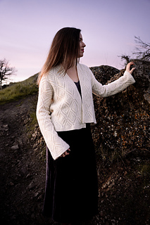 The Luline cardigan was inspired by the feeling of a crisp, cool evening under glistening moonlight. It will add some sparkle and warmth whenever you need it, and can be worn cozy around the house or dressed up for an evening out. Born of a strong mind’s-eye vision of mine, the cableknit pattern was an exceptional challenge to get all the details just as I imagined in my head. After much trial and error in the initial swatching stage, I could not be happier with the result. I hope you enjoy knitting this pattern as much as I enjoyed creating it.