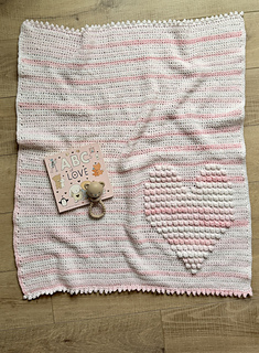 The Lullaby Loves Blanket is a sweet baby blanket featuring a heart in the bottom right corner and delicate picot edging along the top and bottom borders. Made with soft, washable yarn for easy care, it includes an easy-to-follow printable heart chart plus a digital file to help track your progress. With a full video tutorial and clear photo aids, this pattern is perfect for creating a cozy handmade blanket for babies.