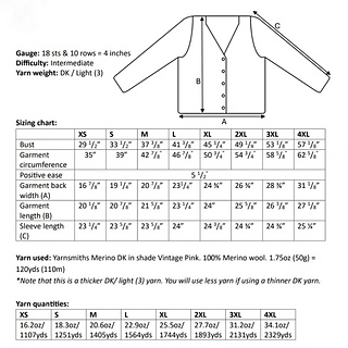 The cardigan has 14cm of positive ease. If you are between sizes you can choose to size down for a more snug fit with 9cm ease, or size up for 19cm ease and a more oversized look. Being top down, the length of the body and sleeves are easily adjustable.