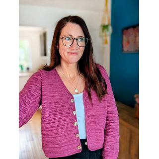 The Lunar is a classic V-neck cardigan with flattering set in sleeves that works up quickly in snuggly Yarnsmiths Merino DK. This yarn is on the thicker end of the DK spectrum, which gives the cardigan its nice lofty structure, so its worth bearing that in mind when choosing a substitute yarn.