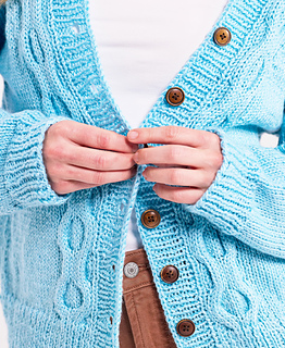 Notions: Tapestry needle, stitch holder or waste yarn, locking stitch markers, cable needle, 7 – ¾” buttons