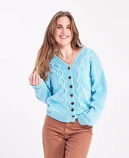 This Cardigan is worked flat from the bottom up in pieces and seamed. The neck edging and button bands are picked up and knit once the Body is complete, a circular needle is used to accommodate the large number of stitches.