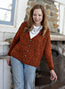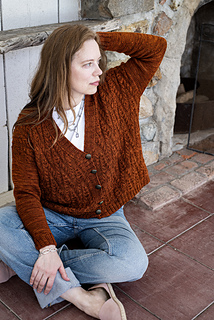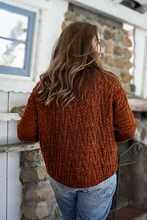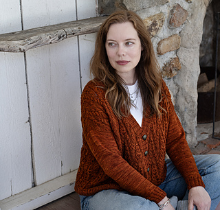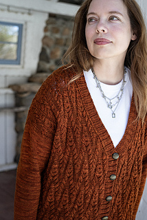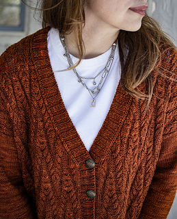 Stockinette sleeves provide contrast to the heavily patterned body, letting the cablework stand out while ensuring a smooth, easy fit through the arms. Ribbing at the hem, cuffs, and button band ties the design together with a neat finish.