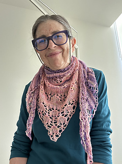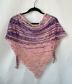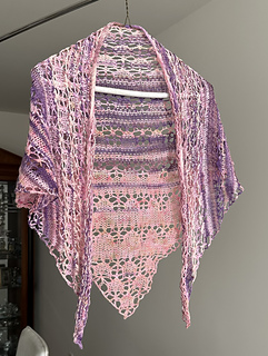 This is a bottom-up knitted shawl with a unique design that results in a triangle shape, and little lace butterflies are incorporated throughout. Perfect for spring. Uses just 1 skein of Merino Cloud in the LYS 2026 color.