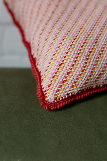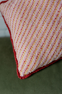 The main cushion is made with Tunisian simple stitch and then coloured yarns are threaded diagonally through the front bars of the stitches to create the woven effect. Take care when weaving not to secure the ends too tight as this will cause the panel to warp.