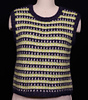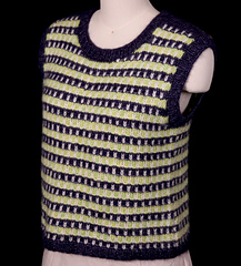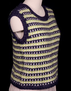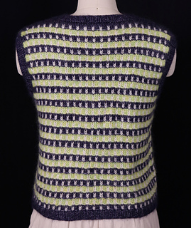 This sleeveless vest features a striking striped design that is accomplished by combining slipped stitches with stranded knitting on one row. Because the yarn is very soft and incredibly light, the vest is knit in two pieces, from bottom to top, and finished with seams at the sides and shoulders to create a supporting structure. Stitches picked up at the neck and armholes are worked in a narrow ribbing, matching the ribbing at the hem.