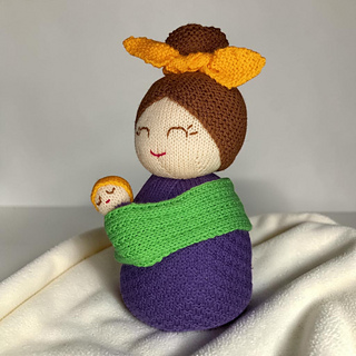 The mother’s hair is crafted with a garter stitch wig, her body is shaped with a diamond seed stitch, and the sling is created in basic seed stitch and fastened with a button for extra charm.