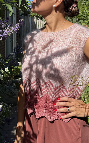 ノースリーブのトップスに甘さを添え, 幸せな気分になれるふんわりとしたトッピングとして着て, その肩をそっと柔らかく包む心地良さを感じて下さい. ボトムアップ式に裾から輪で編み, 中細糸で編むノスタルジックなシェブロンレース模様が波形のヘムラインを作り出します. 続きは控えめに, 極細のシルクモヘア糸一本取りで編み, 肩に向かうにつれ針のサイズを徐々に上げながら編むことで, 透け感と軽さがすばらしいグラデーションになった編地が生まれます. 上に向かうにつれ編む目数が減るので, 予想よりも早く編み終わり, 試着するのが待ちきれない方にはピッタリでしょう. でもその前に, とじ針要らずな, かぎ針1本だけを使うロシア式引き抜きはぎで肩を合わせ, 左右の袖ぐりを輪で2段ずつ編みます. それだけでおしまいです!ロシア式引き抜きはぎは, 細く扱いづらいシルクモヘアのような糸でも最適な手加減ではぎ合せることができ, 編地が攣れることなく, 肩にプルを支える接ぎ目を与えます.