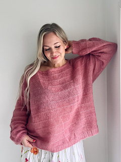 Poolaknits Margo is a light mohair sweater with a simple purled stripe pattern. The sweater is knitted with two strands of mohair held together, creating a soft and airy feel. Margo is a boxy sweater with a relaxed fit and European shoulder-design. The sweater is knitted top down starting from the top of the back which is knitted flat. The stitches for the front are picked up from the top of the back. Once the top part of the front is finished, you will join in the round. The stitches for the sleeves are picked up from the armholes and knitted in the round. The neckline is finished with a simple and timeless i-cord edging. The sweater hem and sleeves are finished with a ribbing.