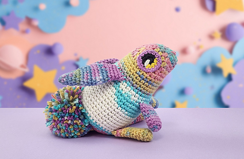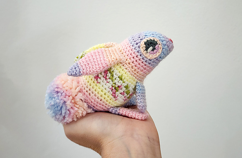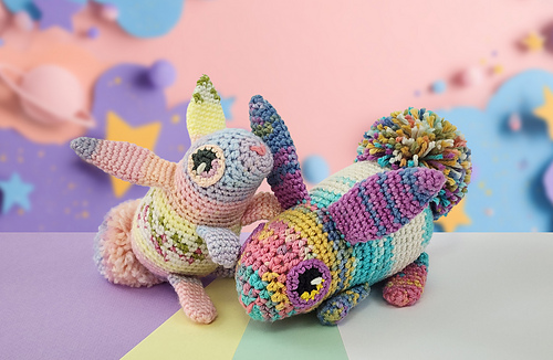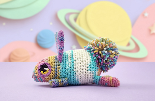 Mars the Bunny is an almost entirely no-sew amigurumi. Only the eyes and pompom tail are sewn on, and the nose is made with a few simple stitches. The pattern also includes a crocheted tail that you can make in one piece with the body if you prefer. The ears and limbs will be joined by crocheting as you go.