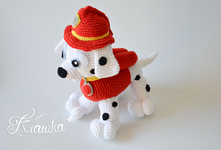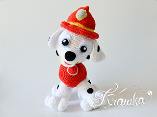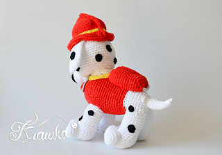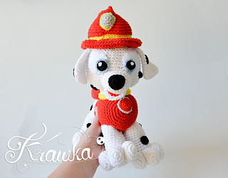 Marshall is 33 cm (13 inches) tall with the hat when standing. He was made for a birthday gift for a 3 year old boy, who loves the Paw Patrol the most in the world, or should I said he loved at the time of his birthday. It’s two months later now and he already loved the PJ masks the most and Blaze… but in spite all of that, this crochet puppy still finds its way to his bed when it’s time to sleep and cuddle someone…
