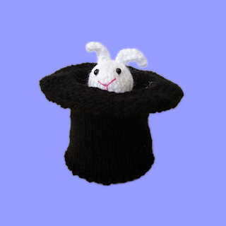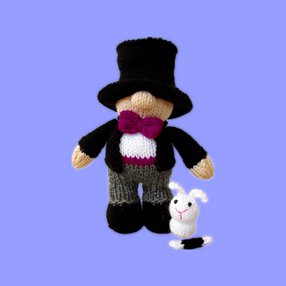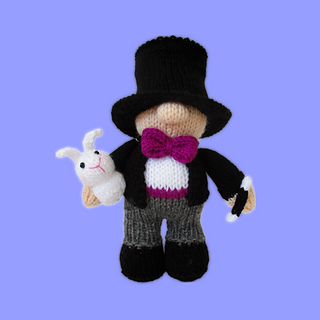 Marvo the Marvellous Magician is practising their tricks, and …. ta-dah! They have magicked a white rabbit out of a hat! Designed by Amanda Berry @fluffandfuzz, Marvo and the rabbit are knitted in acrylic DK yarns on single pointed needles (not in the round). The magic wand is i-cord worked on two DPNs.