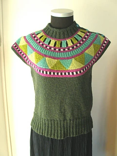 This design is inspired by the beautiful beaded necklaces that the Masai women wear for weddings. You can choose between a vest, a pullover or a cardigan. The design is knitted from the top down - first the yoke then the body and sleeves. The fringes are only meant for the vest and they are joined to the vest, when completed. The vest and the pullover have buttons on the left shoulder, the cardigan has buttons at the center front. The vest has armhole-bands and fringes - the pullover and cardigan have long sleeves.