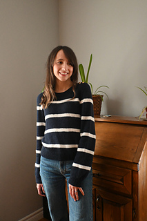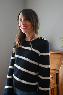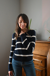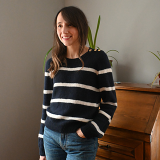 Matelot, c’est un patron de marinière classique. Elle reprend tous les codes de l’uniforme des marins : les rayures et la patte de boutonnage à l’épaule. C’est un véritable classique de la garde-robe à porter dans toutes les occasions.