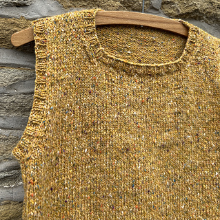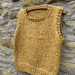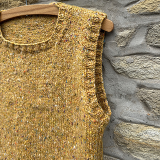 The back and front are knitted flat from the bottom upseparaterate pieces and joined together. The neck and armhole edges are picked up and knitted.