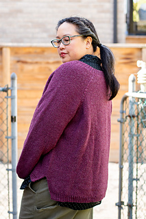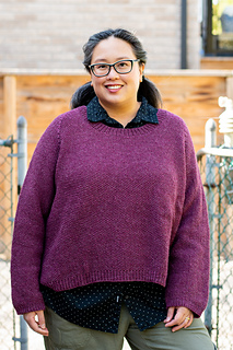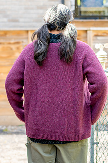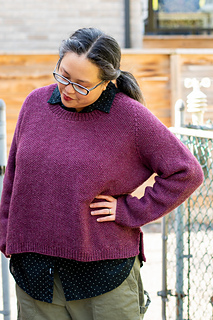Maxome is a cozy, casual, everyday sweater, worked in all-over Seed Stitch with ribbed edges. Sweater begins at the top, where you will work back and forth to shape the scooped neck before joining to work in the round. The body is worked in the round to the split hem, where the back is worked slightly longer than the front and finished with ribbing.
