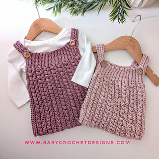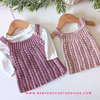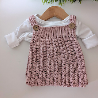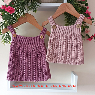 This cute ribbed pinafore dress is made with two panels then joining together down the sides. Using a simple single crochet, half double crochet and puff stitch in the back loops which creates a lovely texture.