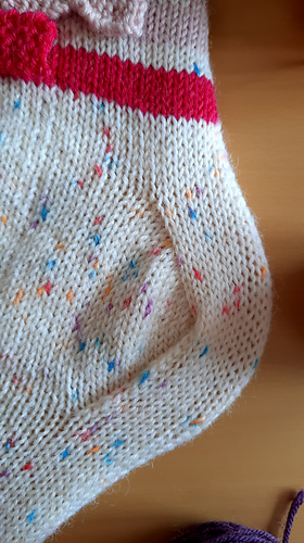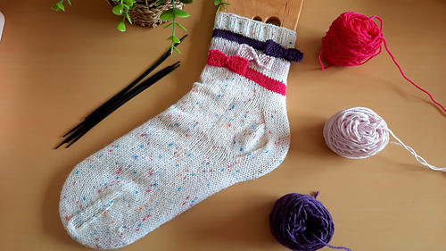 O modelo segue a construção top-down, ligeiramente acima do tornozelo, cós em canelado 2x2, riscas com detalhe de pequenos lacinhos em destaque, calcanhar angular 90 graus teste de uma possível variação do calcanhar diamante e biqueira típica cerzida.