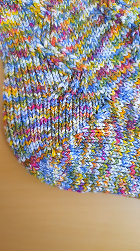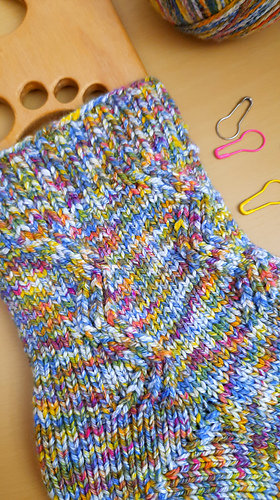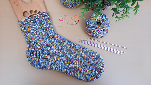 O modelo segue a construção top-down, ligeiramente acima do tornozelo, cós e perna adornados com o ponto fantasia texturado, calcanhar de carreiras encurtadas estilo japonês e biqueira típica cerzida.