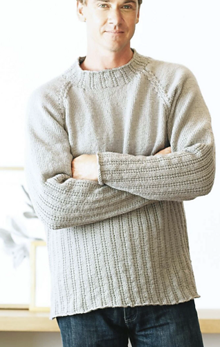 A handsome raglan sweater with wide ribbed borders on the bodice and sleeve.