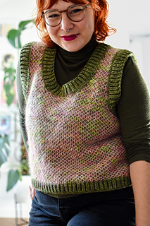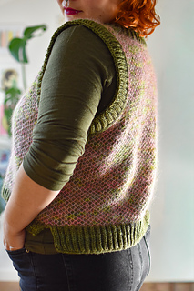 The vest is knit from the bottom up in two-color Honeycomb Brioche with one-color Brioche ribbing details along the hem, armholes, and the scoop neckline. The split hem is knit flat in two pieces. The lower part of the body is knit in the round, then the front and back are split and worked flat with armhole and neckline shaping. After the shoulder seams are closed, stitches are picked up and worked in one-color Brioche in the main color for the ribbing along the armholes and neckline.