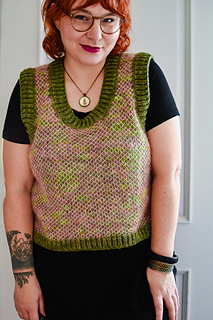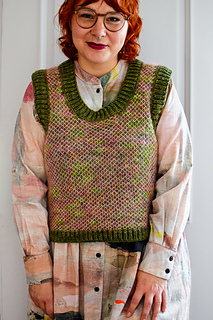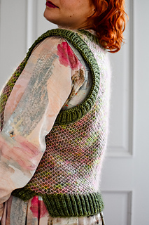 Die Weste wird von unten nach oben im zweifarbigem Netzpatent mit einfarbigen Brioche-Rippen entlang des Saums, der Ärmel- und des Halsausschnitts. Der geteilte Saum wird flach in zwei Teilen gestrickt. Der untere Teil des Körpers wird bis zur Ärmeläffnung in Runden gestrickt, anschließend werden Vorder- und Rückseite separat flach gearbeitet. Nachdem die Schulternähte geschlossen sind, werden Maschen aufgenommen und die Ausschnitte mit einem einfarbigen Patent-Rippenmuster abgeschlossen.