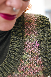 Merino Aran by Hedgehog Fibres (100% Merino, 166 m/100 g) in Swamp Song (MC – green) and Kidsilk Lace by Hedgehog Fibres (70% Mohair/30% Silk, 420 m/50 g) in Rosehip (CC – speckled pink); in size 6.