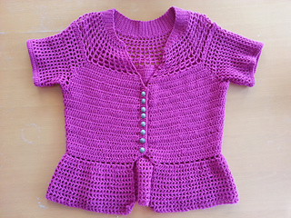 As you work this cardigan seamlessly from the top down, you can try it on every step of the way for a perfect fit. Interior darts nip in the waist and a flirty peplum adds flair. Feminine yet not frilly, sections of solid stitching mix with sections of mesh for contrast, structural support, modesty, and style.