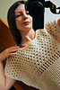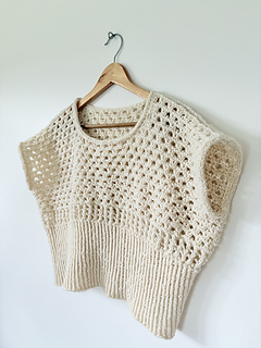 Inspired by fishing nets and coastal style, it features an open mesh stitch pattern across the body and shoulders, resembling the look of crochet mesh patterns.