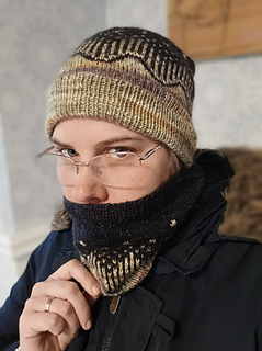 This pattern consists of a description for 4 garments, beanie, cowl, fingerless mitten and sock, with the same multicolored knitted pattern on.