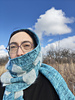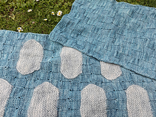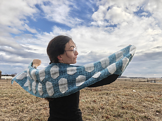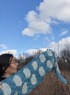 The clouds are knit into a background canvas made from a smooth yarn the color of the sky. Just as the puffy cumulus clouds easily disperse, one side of the scarf is cloud-free. While the actual cloud-free sky is smooth as a mirror, sometimes I imagine what would it be like if it could reflect the earth like water reflects the sky. Then I would see the endless grid of corn and soybean fields. The basketweave pattern is meant to mimic that texture.