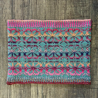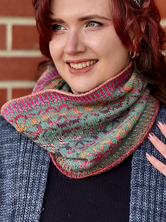 • The stranded colourwork used in this cowl is ideal for beginners as it is not necessary to catch floats (there are no sections with more than 5 sts of a colour).