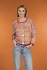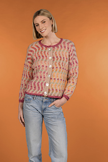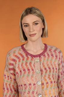 Cropped jewel neck cardigan is worked from the bottom up in pieces, then sewn together. Sleeves are worked separately from the bottom up, then sewn in place. Body and sleeves are worked in stranded Stockinette stitch pattern.