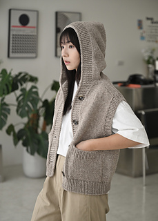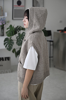The Mila hooded vest is started from the top and knitted down to the yoke section. The left front, back, and right front are then knitted separately until reaching the underarm length, after which they are joined to knit in flat until the hem. the cast-on edge of the hood’s top is seamed together using the horizontal seam. Finally, add pockets to both sides of the garment.