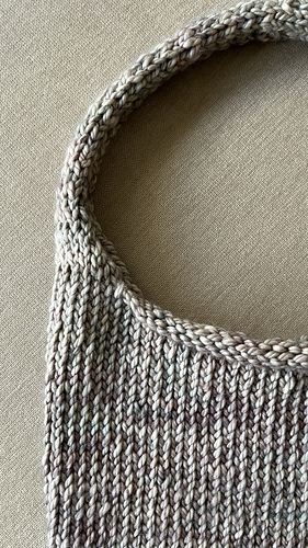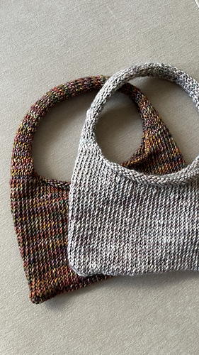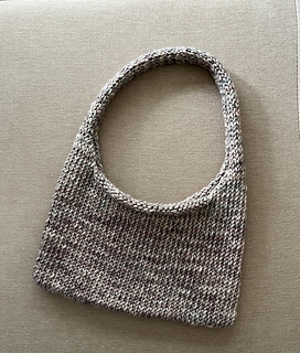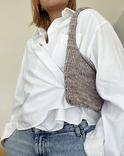 Mini Shoulder Bag is a small knitted bag worked in the round from the bottom up using chunky yarn. The body is knit in stockinette stitch, and the strap is created by working two handles directly from the live stitches.