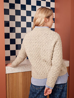 The body is worked in a cable pattern, starting with the upper back, which is worked back and forth. The upper back and front of the sweater are shaped with short rows. After finishing the upper part, the front and back are joined and the rest of the sweater is worked in the round. The body ends with 1 x 1 Twisted Rib. The neck is worked entirely in 1 x 1 Twisted Rib. The sleeves are worked in the cable pattern in the round, shaped, and again finished with 1 x 1 Twisted Rib.