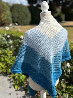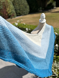De voorbeeldsjaal is gemaakt in Drops Air (met tunische haaknaald 8 mm) en ik gebruikte 50 g ecru - 50 g ochtendmist - 100 g zeeblauw - 100 g pauwblauw. Het totale gewicht van de voorbeeldsjaal = 260 g = 780 m looplengte. Drops Air kan bvb. besteld worden bij Wolly Wonka, Wolplein of Hobbydoos.