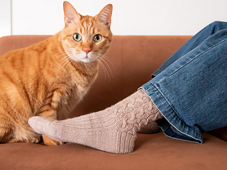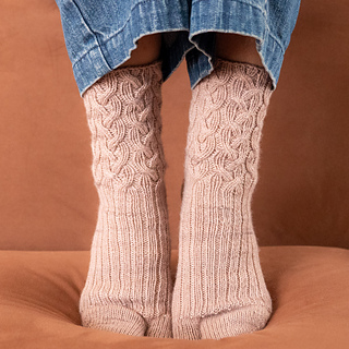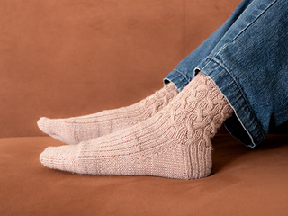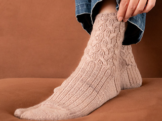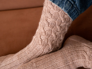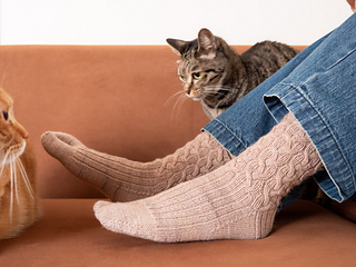 三つ編みのようなケーブル模様が、レッグに映える靴下です。全体はリブ編みをベースに構成され、リブがレッグからインステップ(足の甲)、かかとへとシームレスに流れ、すっきりとフィットする履き心地に仕上がります。