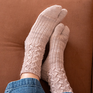 These socks are worked cuff-down with gussets, a heel turn, and a heel flap, and include three toe options: Standard Wedge Toe, Easy Toe (no grafting), and Tabi-toe. Video tutorial links are included. The cable patterns are charted only.