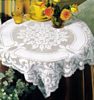 Filet tablecloth, scrolls, roses in center. Scalloped edges.