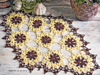 Diamond shaped runner has 9 round motifs in brown and yellow, with brown edging.