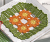 Square doily has orange and yellow flower motifs 2x2 in center with green border.