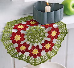 Round doily with green center, ring of red and yellow flower motifs, green border.